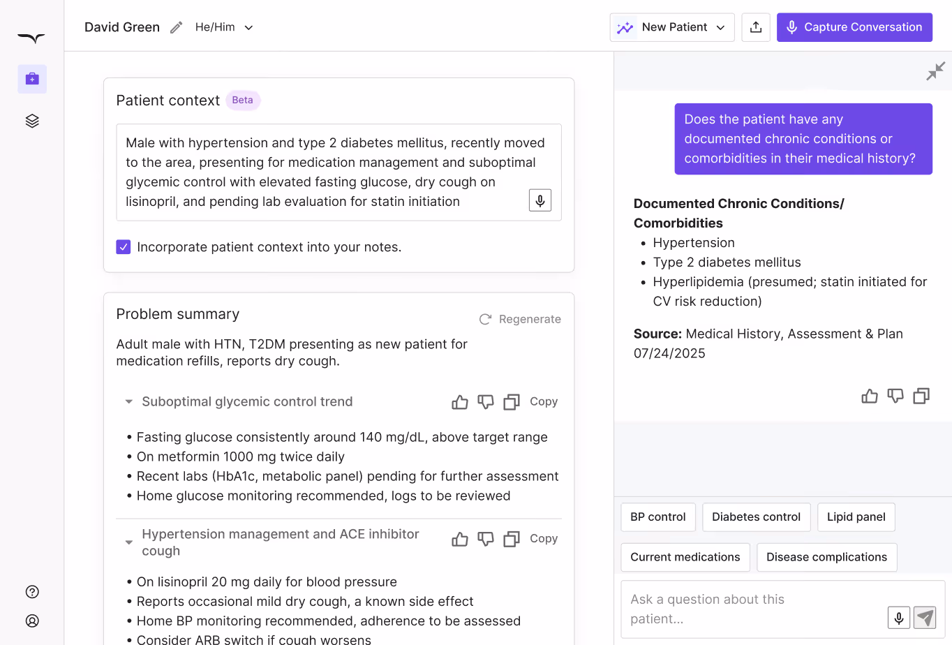 The AI clinician assistant surfaces relevant details about your patient, helps inform your decisions, and tailors your notes to your style. When we say ask anything, we mean it.