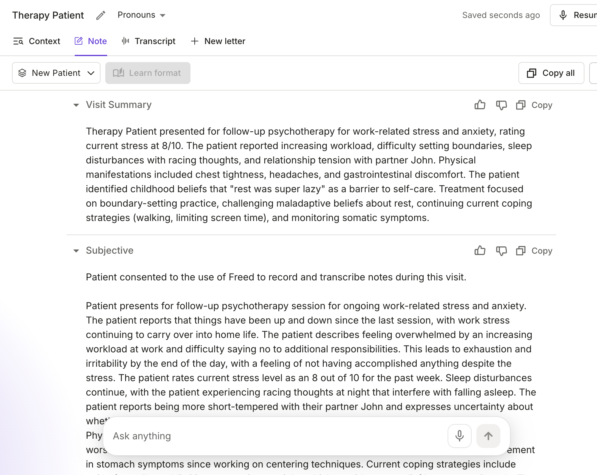 One psychiatric clinician writes, “I was getting burned out, but that all changed with Freed. Now visits feel like I have a personal scribe in the background capturing every detail, freeing me to be 100% present with my patients. It’s far more efficient to review and edit a note already structured in SOAP format than write one from memory. I’ve been freed!”