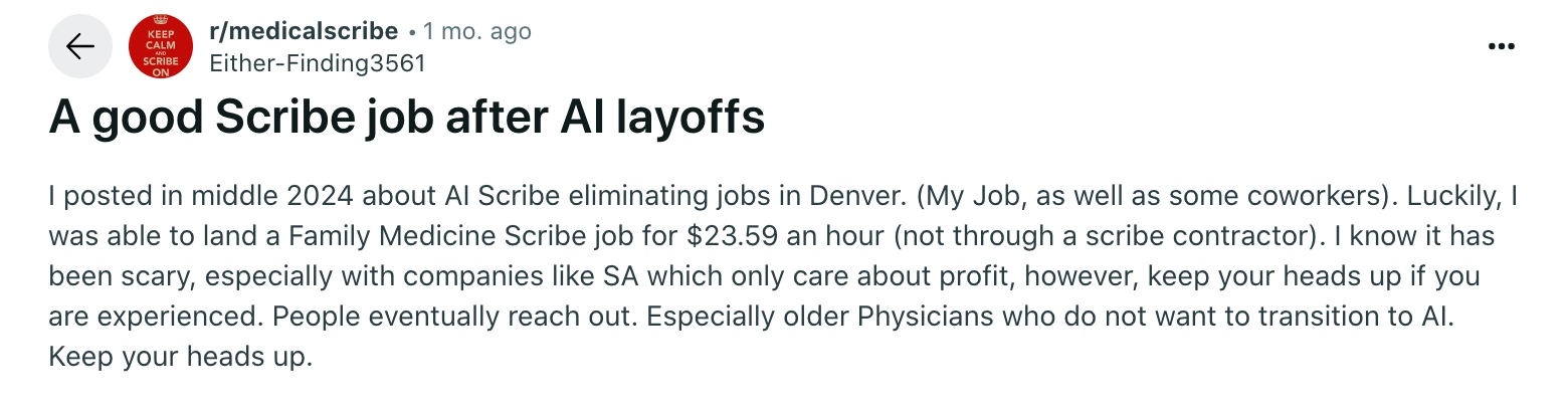 Still, there are stories with a happy ending. The medical field is notoriously slow to adopt new tech, and plenty of healthcare facilities will stick with human scribes for as long as they can. So if this job appeals to you, go for it!